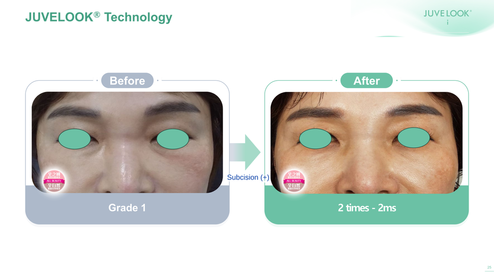Juvelook i 的平均顆粒大小僅約 20 µm,遠小於其他劑型,能夠使用更細小的針頭或鈍針進行注射。這使得它非常適合用於眼周等精細部位,且有助於減輕疼痛,並實現更穩定的注射。主要適用於改善眼周細紋、黑眼圈、眼下凹陷(淚溝)及全臉療程。